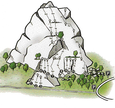 Il contrafforte roccioso su cui è allestita la palestra è un classico affioramento di micascisti gneissici; la falesia esposta ad est raggiunge in altezza 120 m.