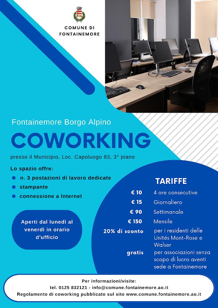 Il Comune di Fontainemore ha reso disponibili, presso il Municipio sito in Località Capoluogo 83, una sala per coworking dotata di 3 postazioni di lavoro dedicate, di stampante e di connessione internet.