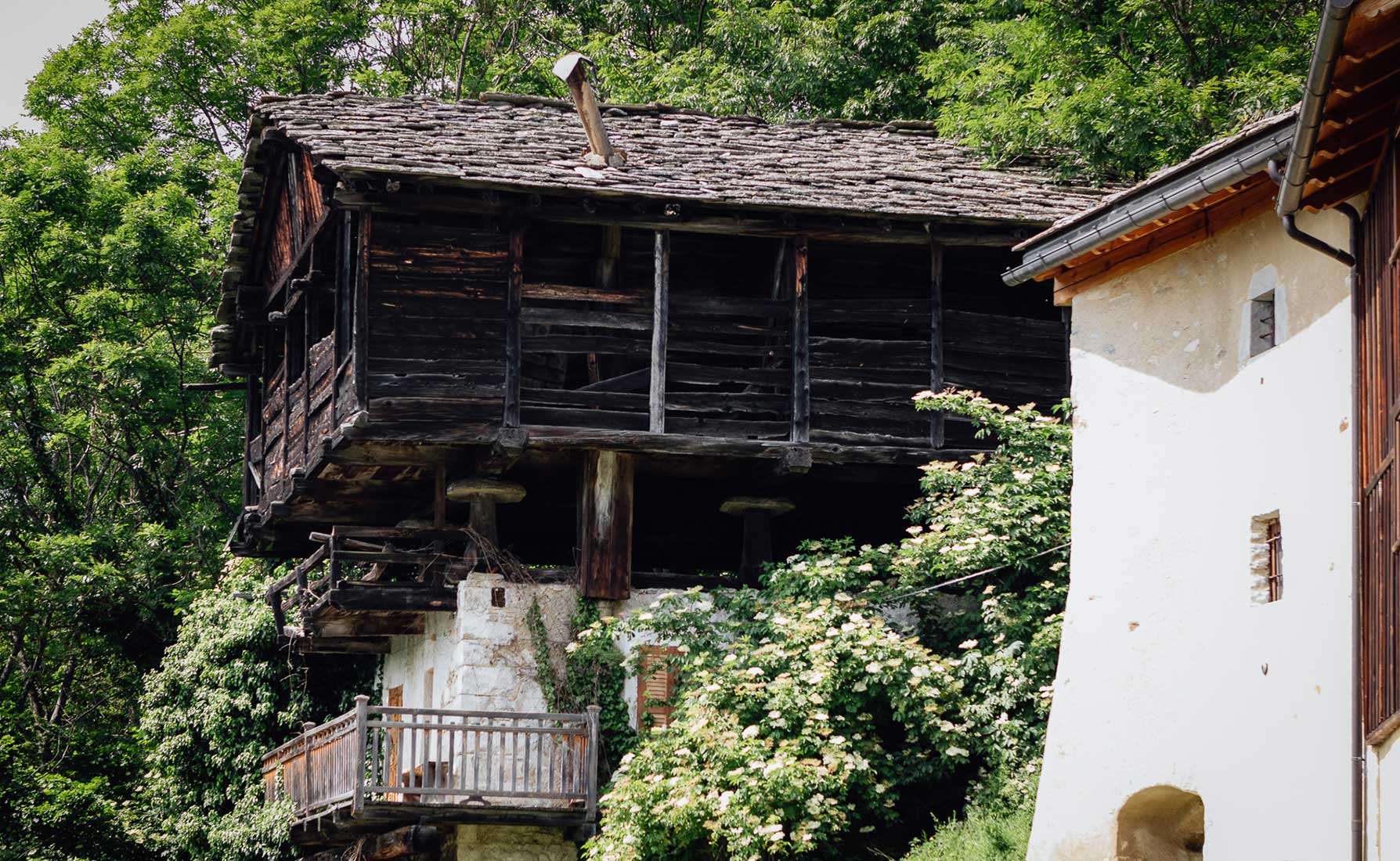 Sono presenti altri edifici separati o affiancati: per esempio il rascard, nel patois locale "éra", con stalla nella parte in muratura e fienile con area per la battitura del grano nella parte sovrastante in legno. Spesso è presente anche uno stanzino per la stagionatura dei salumi.
