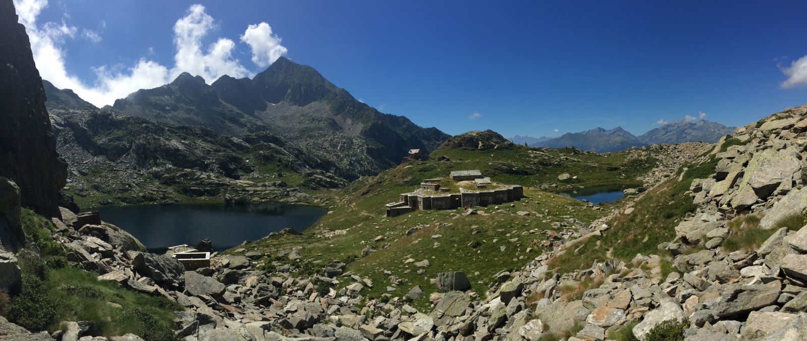 La struttura in pietra è costruita intorno alla roccia montonata al centro di un anfiteatro che si affaccia sui laghi omonimi ai piedi del massiccio del Mont Mars (2600 m).