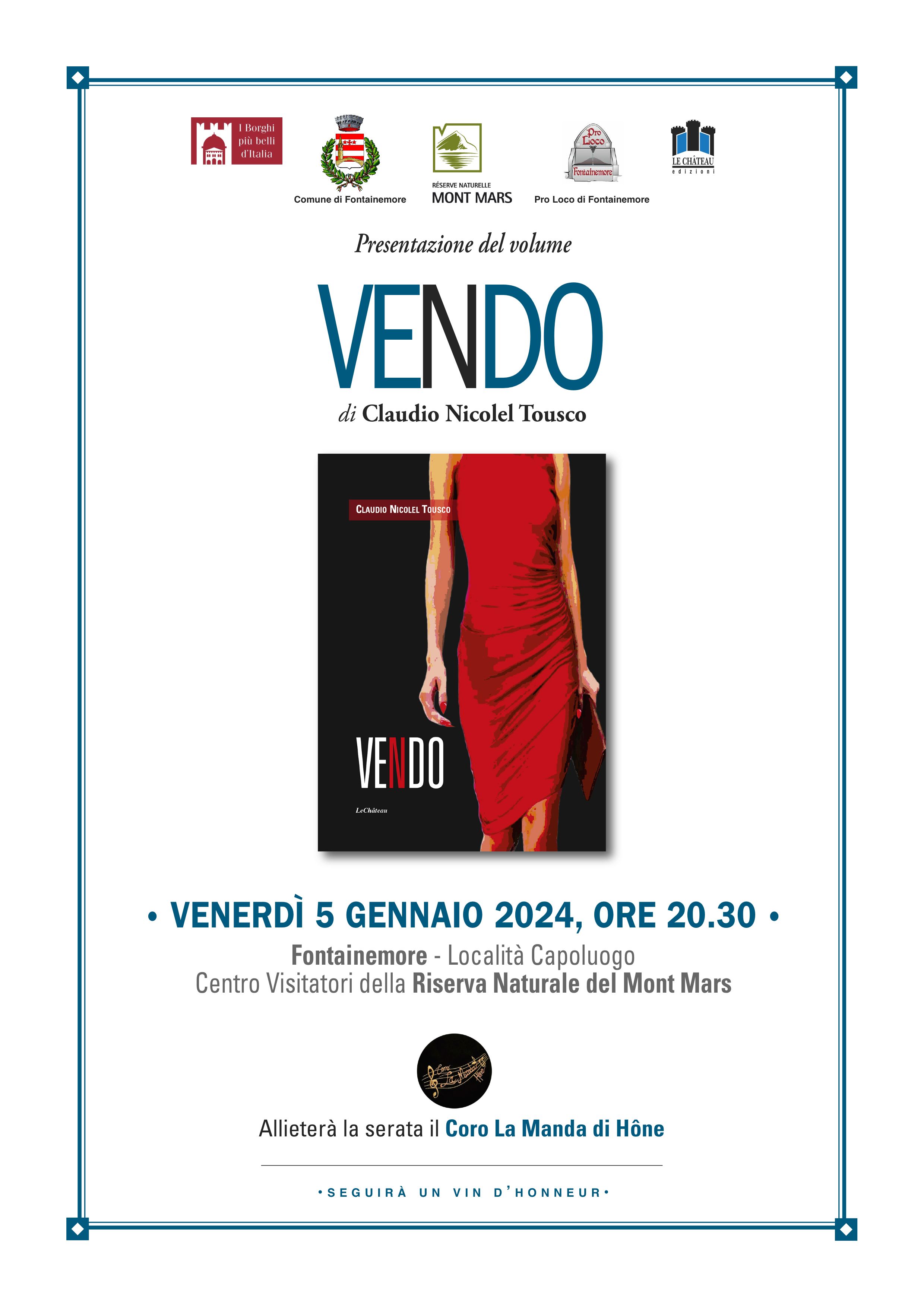 Venerdì 5 gennaio 2024, alle ore 20.30, a Fontainemore presso il Centro Visitatori della Riserva Naturale del Mont Mars, presentazione del volume "VENDO" di Claudio Nicolel Tousco, edito da Le Chateau di Arvier.